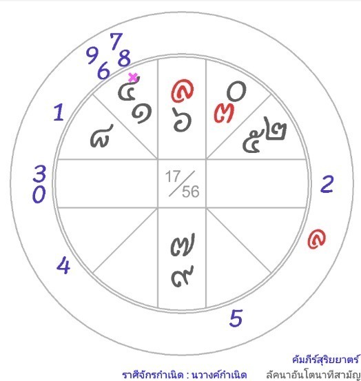 ...จากดาว ๒ เจ้าเรือนภพปุตตะที่ราศีกุมภ์ มีดาว ๐ วินาศนะกุมลัคน์ ที่ราศีเมษก็มีดาว ๖ เจ้าเรือนภพมรณะ [ตาย ] เป็นศูนย์พาหะ [ ตัวนำพา ]