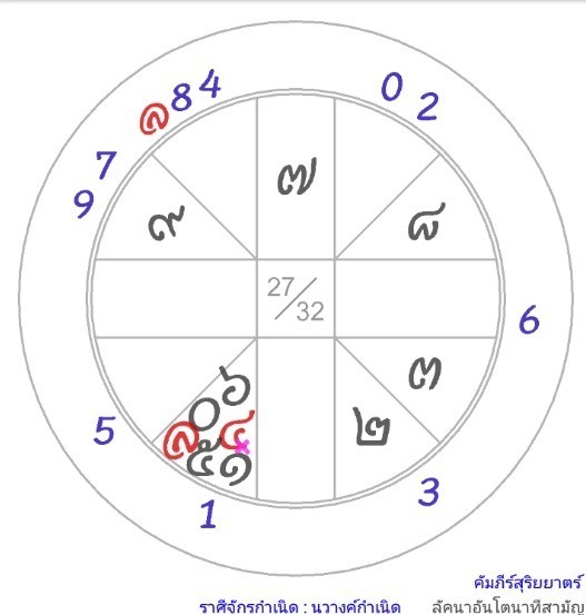 กุมลัคน์ มีดาว ๓ [ มรณะ ] ทำมุม 4 มีเกตุ [ ต่างประเทศ ] ทำมุม 10 มี ๗ [ การเรียนในวัยเด็ก ] และ ราหู [ ต่างถิ่น ] ทำมุมปลายหอกมาที่ลัคนา ... ถือว่าได้มีเกณฑ์ถึงกันอย่างแน่นอนในเรื่องต่างประเทศกับเจ้าชาตาโดยตรง ...