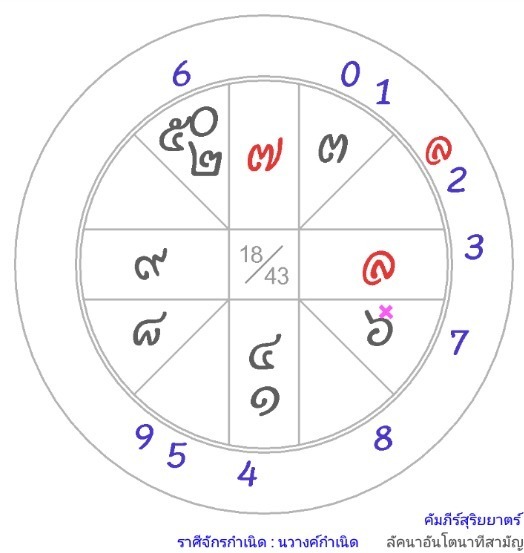...ดาว ๑ มรณะ [ ลึกลับ ] กุมดาว ๔ ศุภะ [ ความสำเร็จ ] ได้คู่วิชาการ [ วิชาขลัง พยากรณ์แม่น ] สถิตย์ที่ราศีตุลย์ภพกัมมะ [ งาน ] แถมดาว ๖ ยังโยคหน้าช่วยอยู่ที่ราศีธนูอีกด้วย ... และดาว ๑ + ๔ ยังเล็ง ดาว ๗ ที่ราศีเมษซ้ำซ้อนชัดเจนเข้าไปอีก