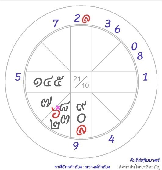 ... ที่ราศีกรกฏเรือนดาว ๒ กัมมะ มี ๑ มหาจักร + ๔ + ๕ อุจจ์ โอ่อ่า ใหญ่โต ...