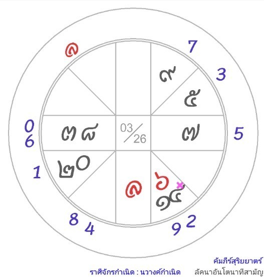 ... ดาว ๖ ตนุ - [ เจ้าชาตา ] + มรณะ - [ เดือดร้อน ] อยู่เรือน ๓ กฎุมภะ - [ เงิน ] + ปัตนิ - [ สามี ] ...
