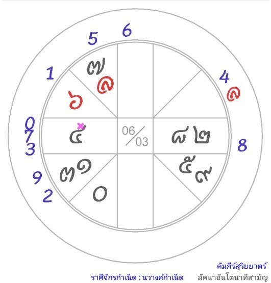 จากลัคนาวันจากดวงเดิมที่ราศีเมษได้ว่า ... ดาว ๓ ตนุ [ เจ้าชาตา ] + มรณะ [ ตาย ] ไปอยู่ราศี